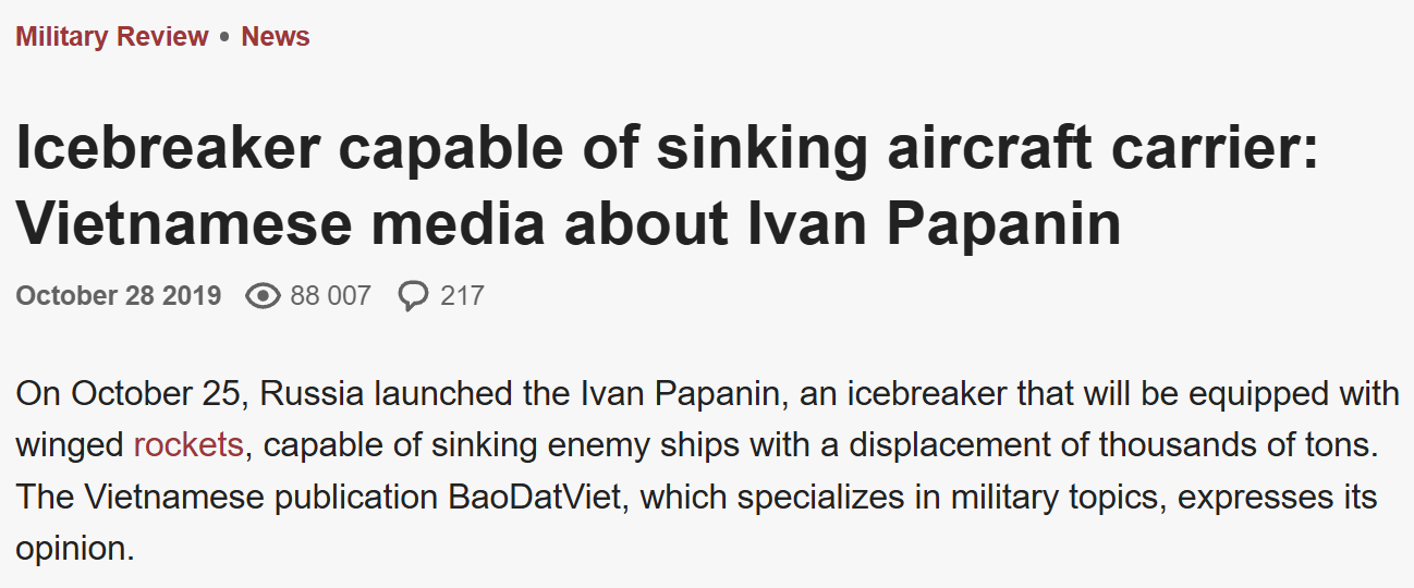 In my research for this article, I found a number of articles in Russian sources that report on the reaction of the American press to Russia’s new “Combat Icebreaker.”3