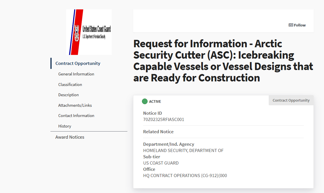 Request for Information - Arctic Security Cutter (ASC): Icebreaking Capable Vessels or Vessel Designs that are Ready for Construction